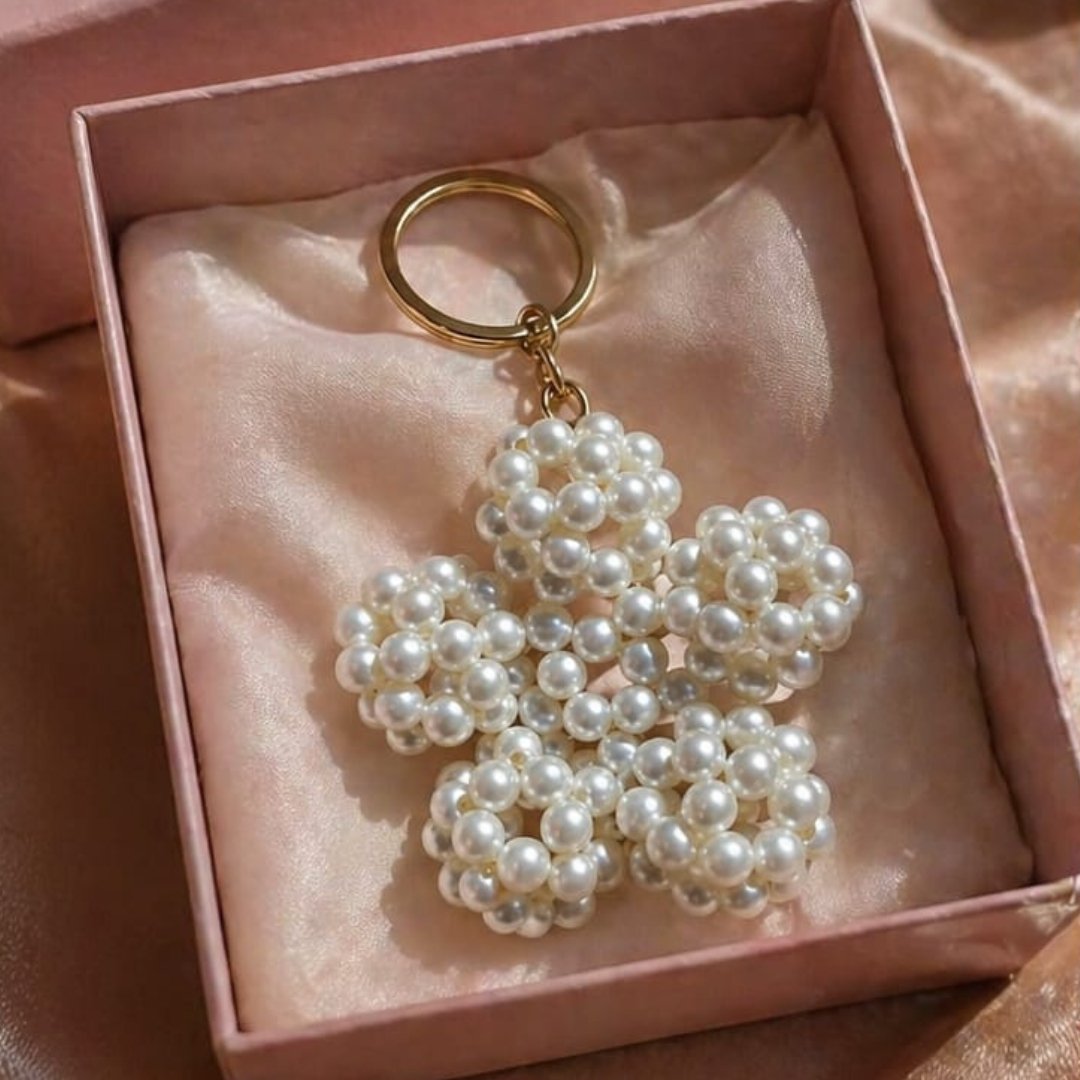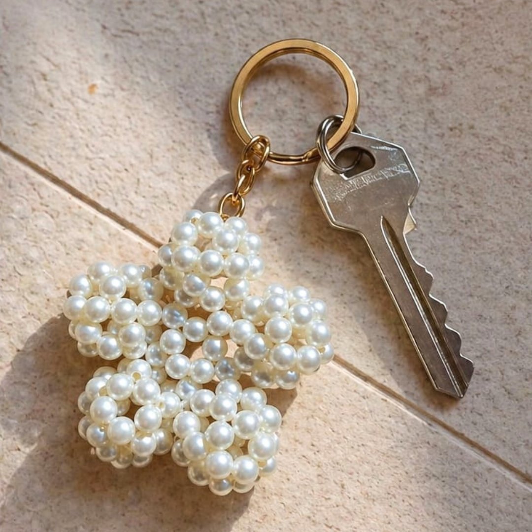 A cute flower-shaped beaded keychain designed to add a soft and stylish touch to your keys or bags.